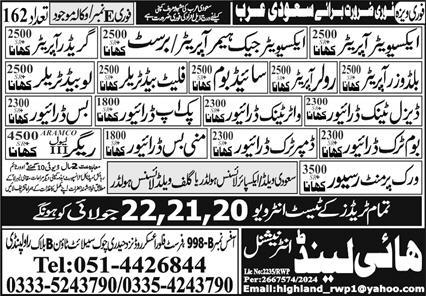 High Land International invites applications for job positions advertised in daily Express dated 20 July 2024 for following vacancies in Dammam, riyadh Saudi Arabia.