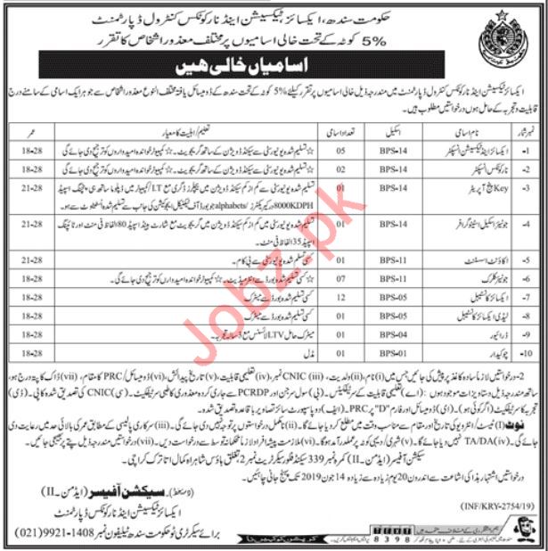 Vacancies in Excise Taxation & Narcotics Control Department Advertisement May 2019