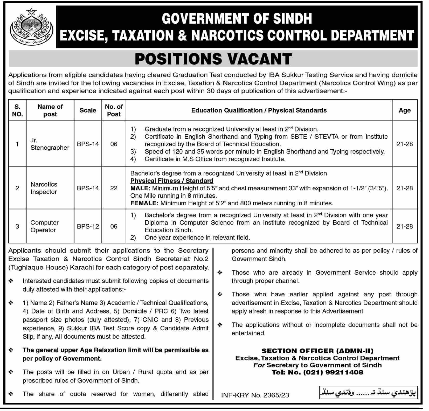 Vacancies in Excise Taxation & Narcotics Control Department Advertisement June 2023