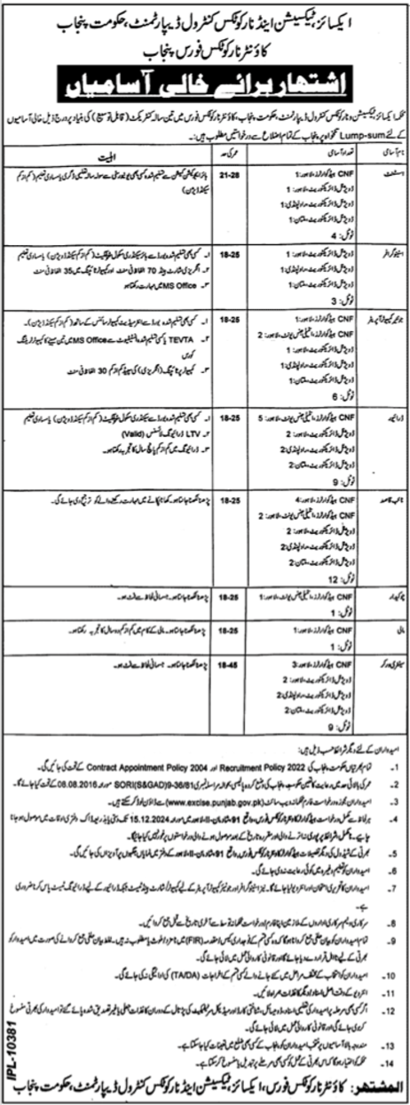 Vacancies in Excise Taxation & Narcotics Control Department Advertisement December 2024