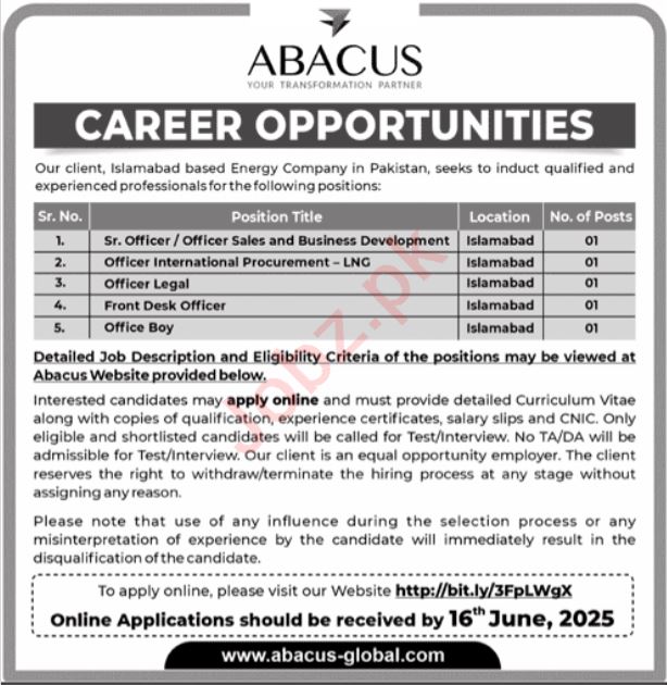 Abacus Global jobs advertisement dated about 1 June 2025 in daily Jang Newspaper invites application for the vacant post of Business Development Officer, Office Boy, Officer Legal, Sales Officer, Officer International Procurement, Front Desk Officer and Officer in Rawalpindi, rawalpindi Punjab Pakistan. Candidates with Bachelor, Matric, Master and Intermediate etc. educational background will be preferred.