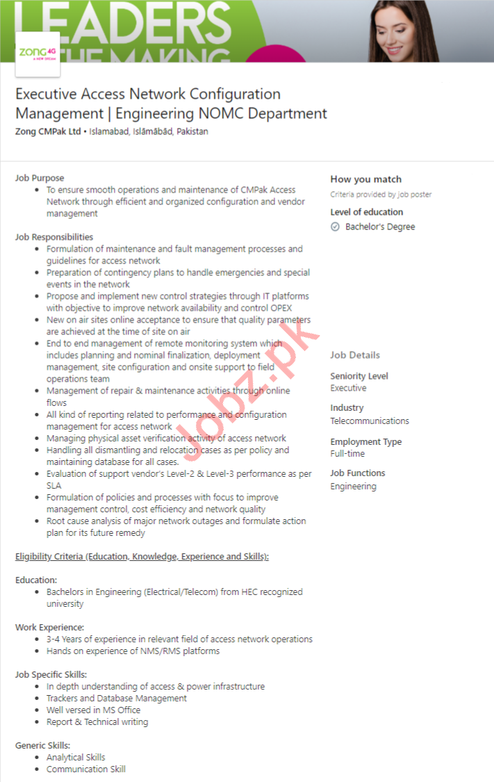 Vacancies in Zong Pakistan Advertisement March 2020