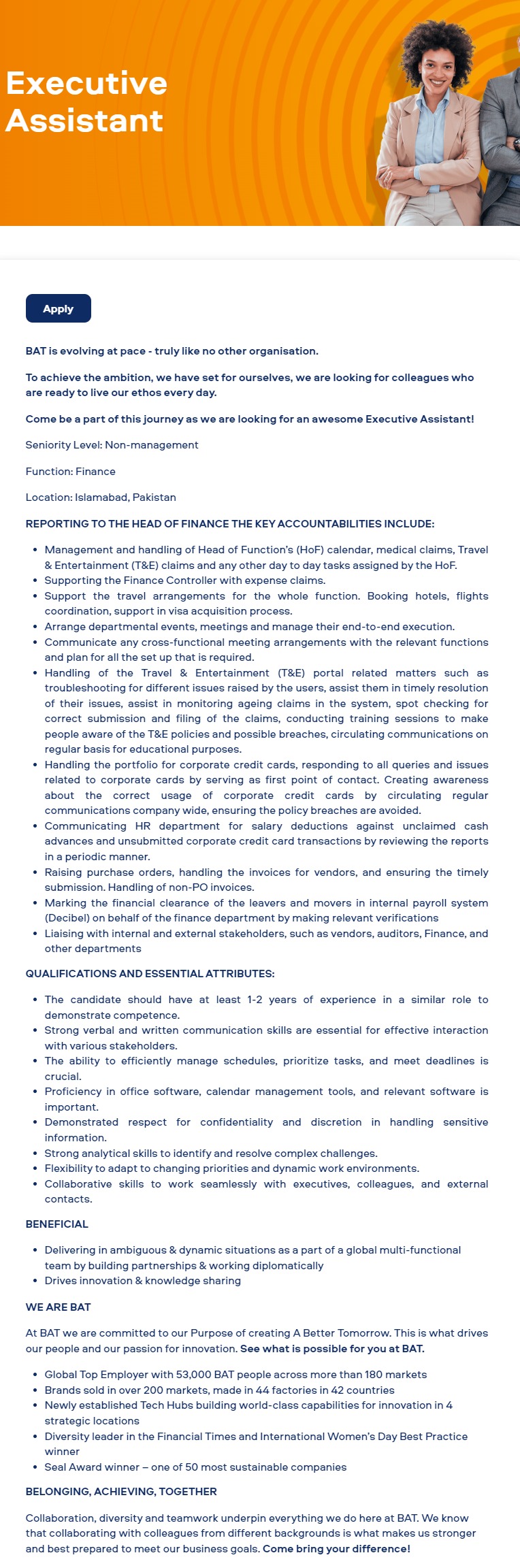 Original Source: https://careers.bat.com/job/islamabad/executive-assistant/27325/7222895936