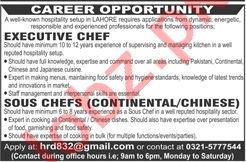Executive Chef & Sous Chef Jobs 2020 in Lahore