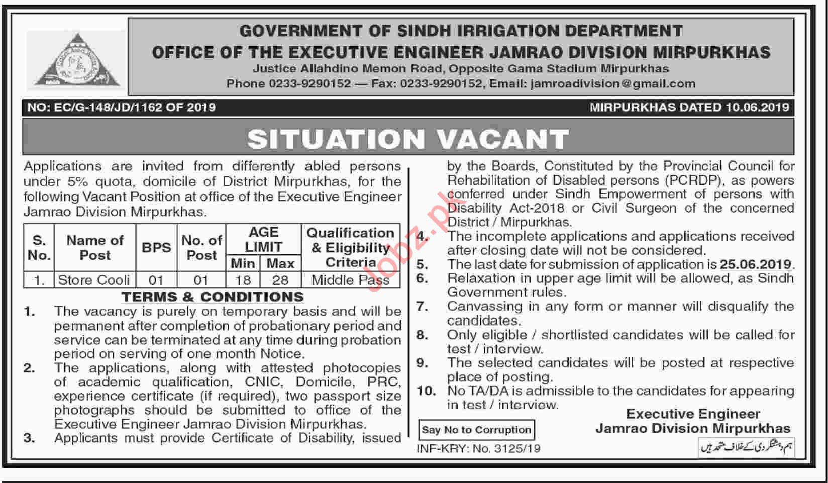 Executive Engineer Jamrao Division Mirpurkhas Jobs 2019