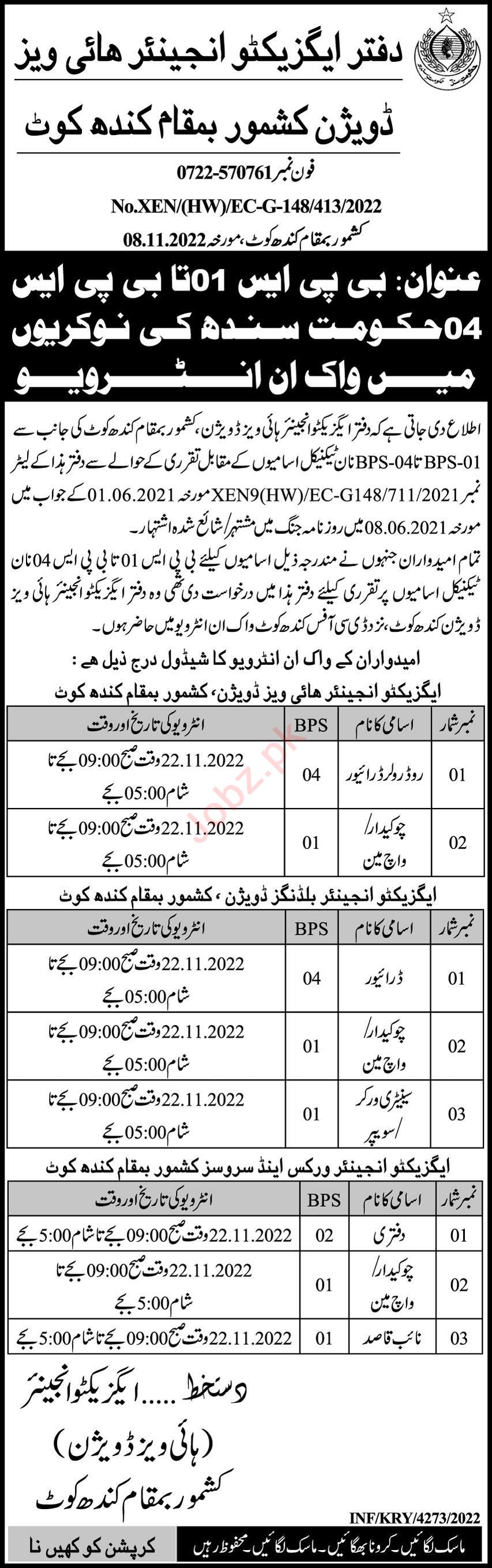 Executive Engineer Office jobs advertisement dated about 13 November 2022 in daily Express Newspaper invites application for the vacant post of sanitary worker, driver, road roller driver, chowkidar and watchman in Kandhkot, kandhkot Sindh Pakistan. Candidates with Middle and Primary etc. educational background will be preferred.