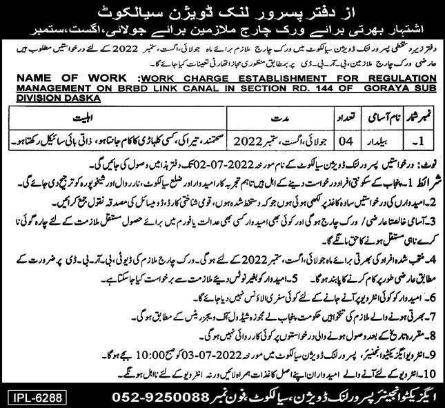 Irrigation Department is looking for candidates for following posts as per job advertisement published in daily Dawn Newspaper of June 18, 2022 for location Sialkot, sialkot Punjab Pakistan: