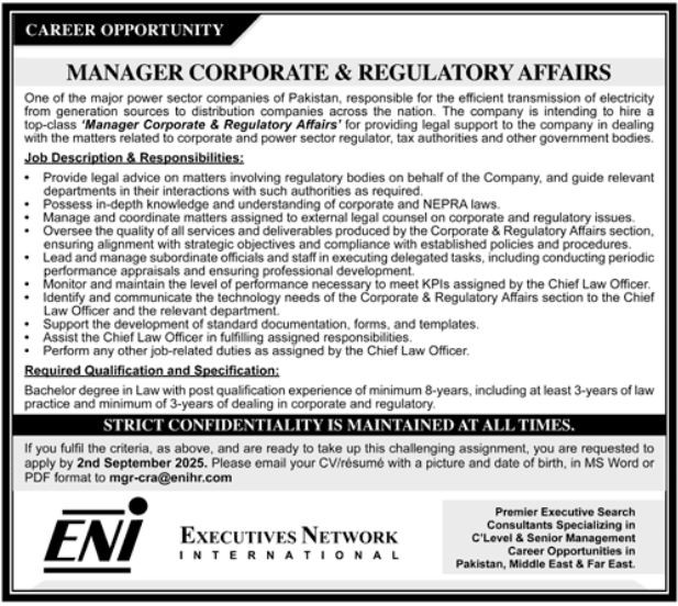 Vacant posts including manager corporate regulatory affairs are announced in Executive Network International ENI Rawalpindi, rawalpindi Punjab Pakistan as per 17 August 2025 advertisement in daily Jang Newspaper. Educational qualifications required Bachelor, MS and Master etc.