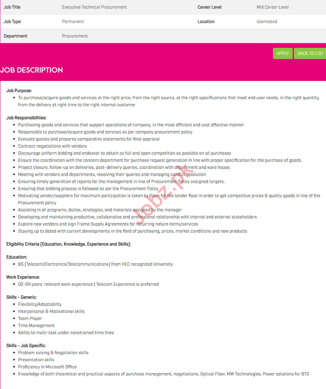 Apply as per details in job advertisement. Login to view further details of how to apply via https://www.jobz.pk online.