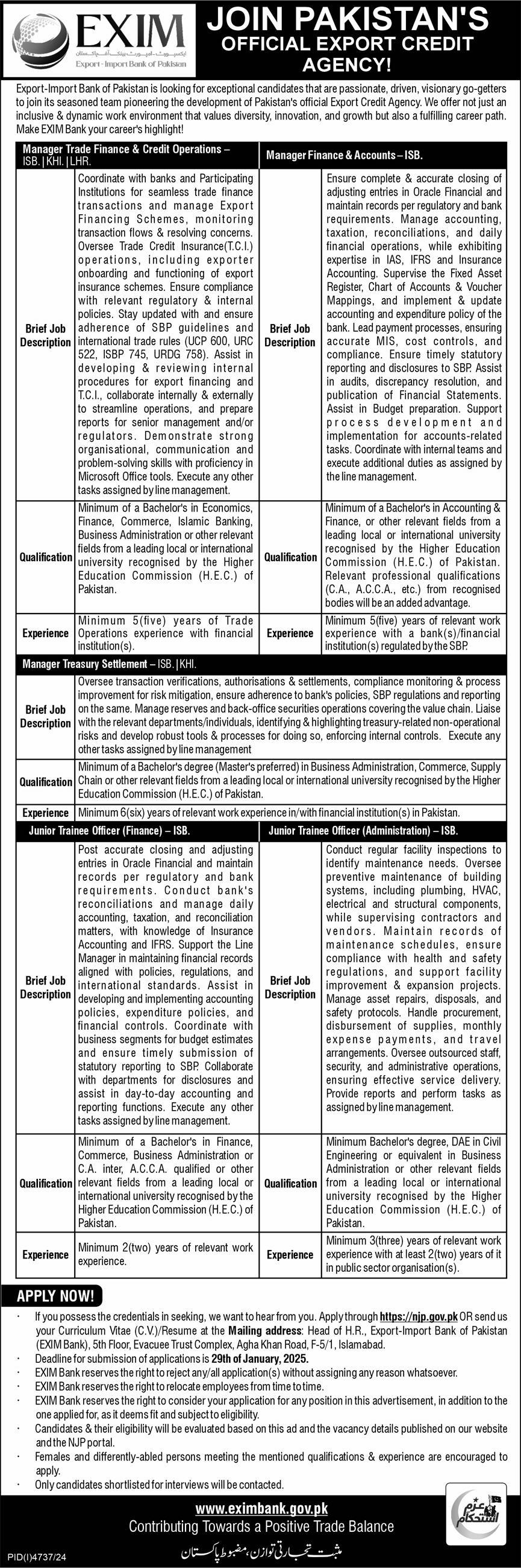 Exim Import Bank of Pakistan jobs advertisement dated about 15 January 2025 in daily Express Newspaper invites application for the vacant post of manager trade finance credit operation, manager treasury settlement, trainee officer finance and trainee officer administration in Islamabad, islamabad Islamabad Pakistan. Educational qualifications required Master, MS and Bachelor etc.