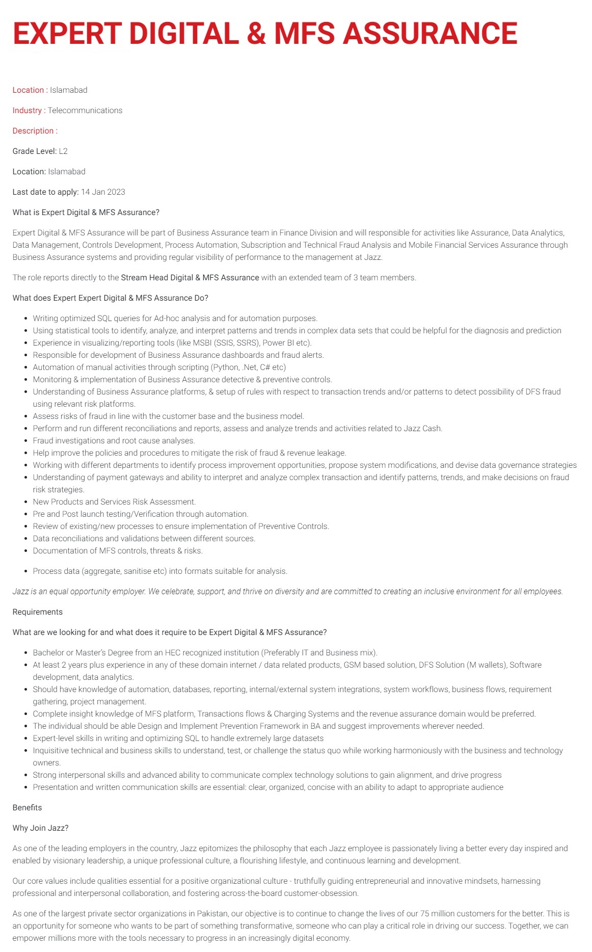 Jazz Telecom jobs advertisement dated about 11 January 2023 in daily Other Newspaper invites application for the vacant post of expert digital mfs assurance in Islamabad, islamabad Islamabad Pakistan. Educational qualifications required Bachelor and Master etc.