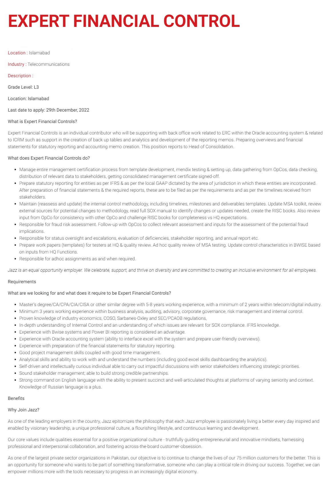 Jazz Telecom jobs advertisement dated about 28 December 2022 in daily Other Newspaper invites application for the vacant post of expert financial control in Islamabad, islamabad Islamabad Pakistan. Bachelor etc. educational qualification will be preferred.