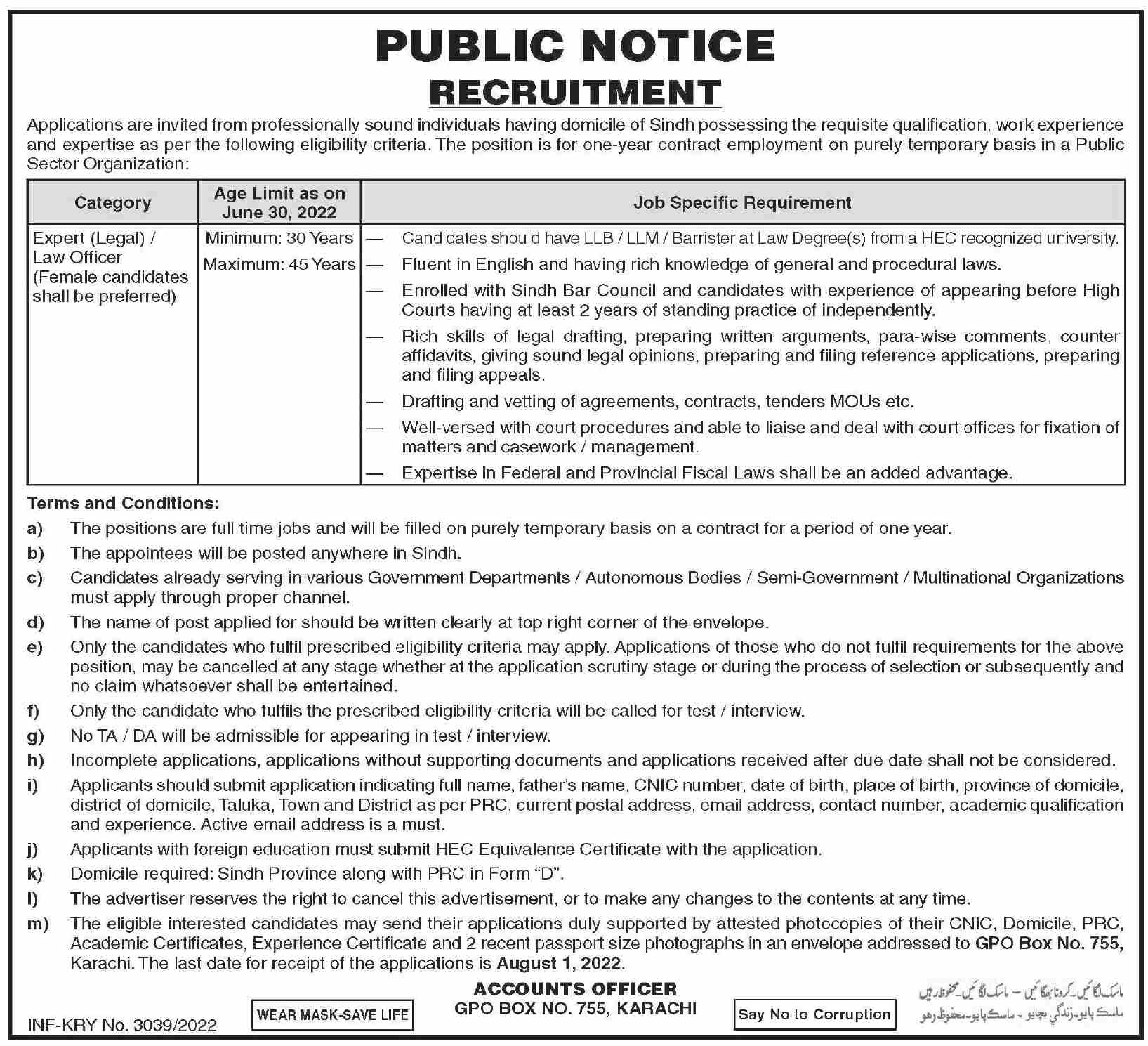 Expert Law Officer Jobs 2022 in Public Sector Organization