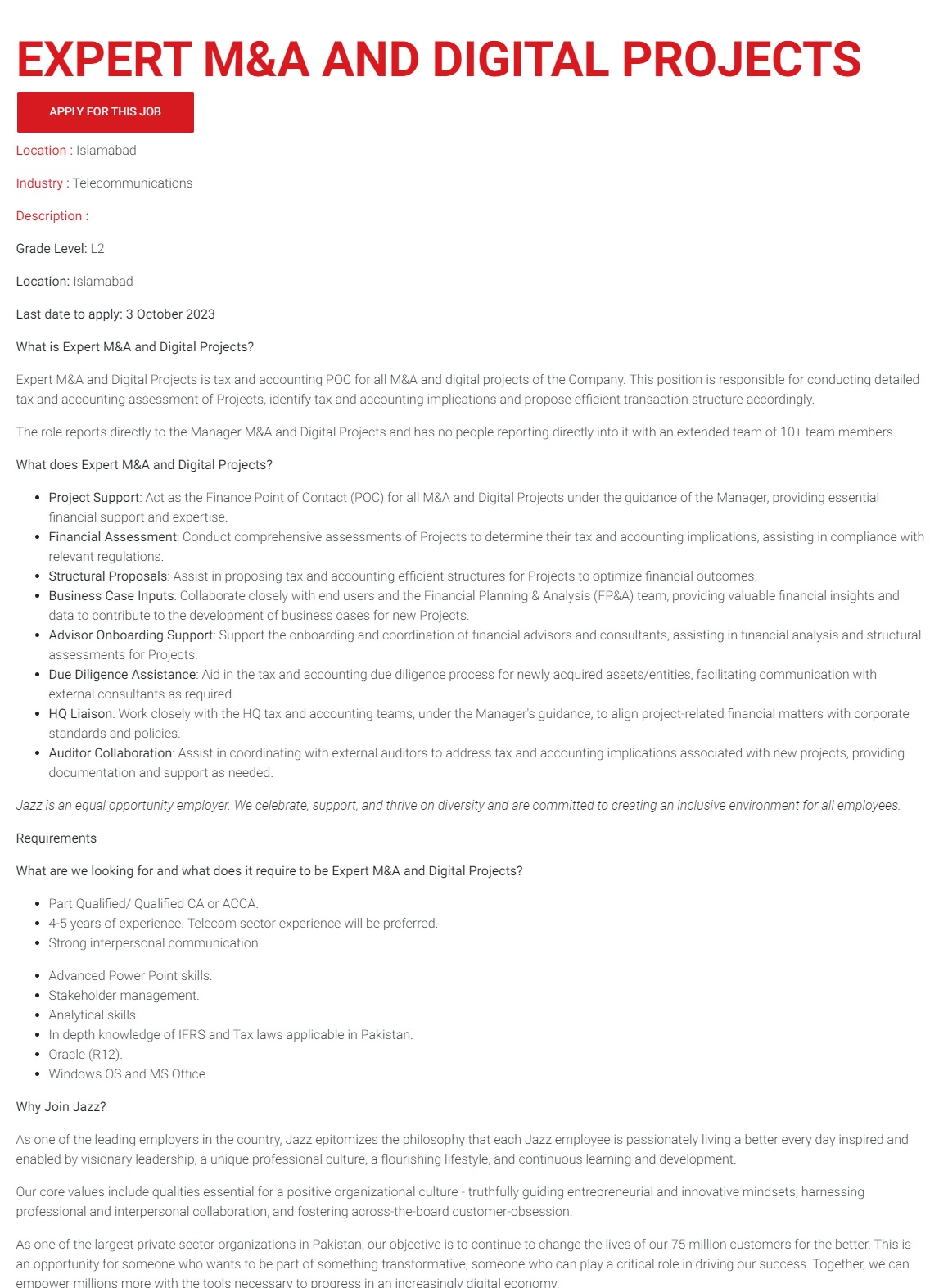 Jazz Telecom jobs advertisement dated about 27 September 2023 in daily Other Newspaper invites application for the vacant post of expert ma digital projects in Islamabad, islamabad Islamabad Pakistan. Persons with CA and ACCA etc. education can apply.
