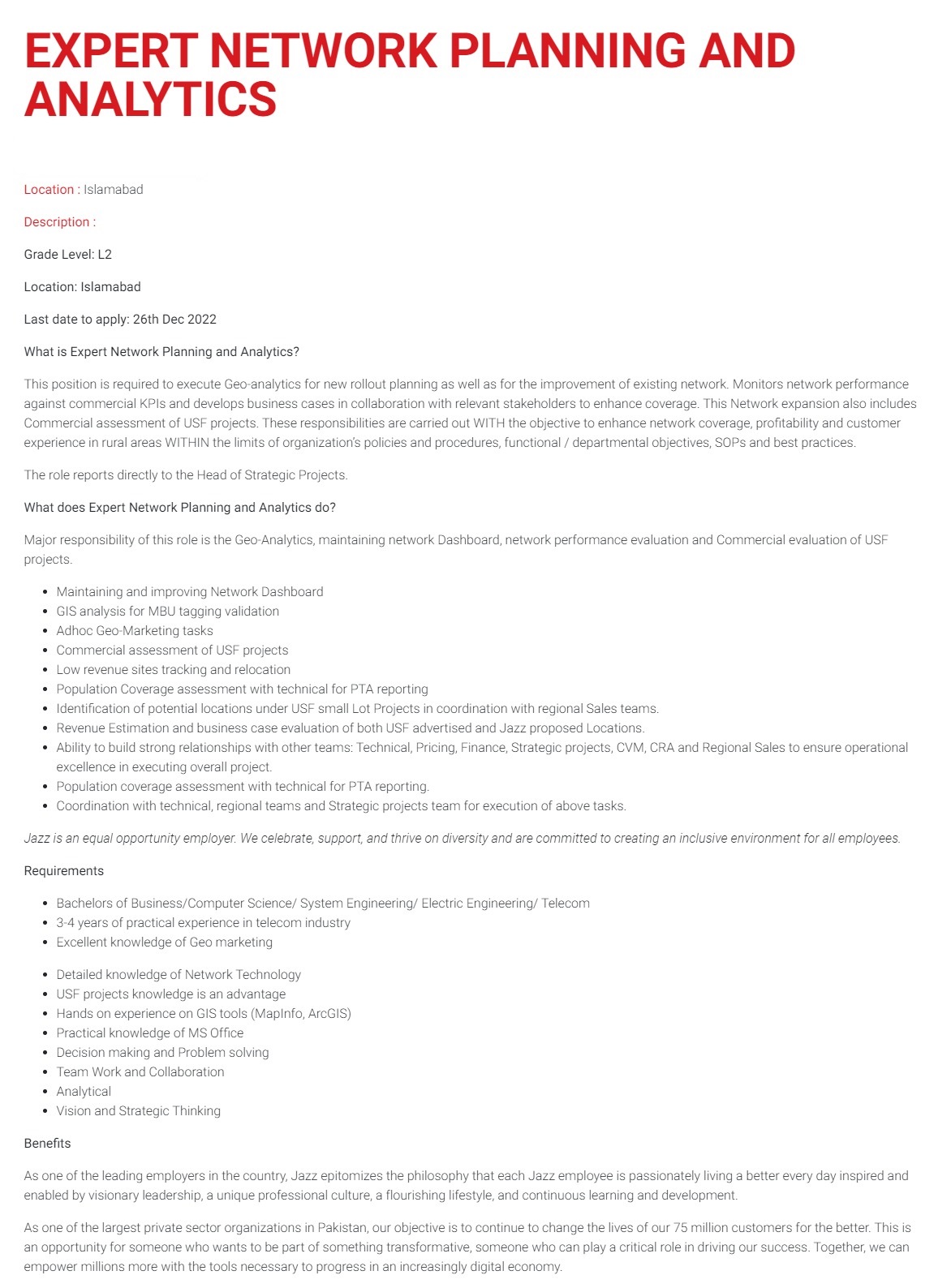 Jazz Telecom invites applications for job positions advertised in daily Other dated 21 December 2022 for following vacancies in Islamabad, islamabad Islamabad Pakistan.