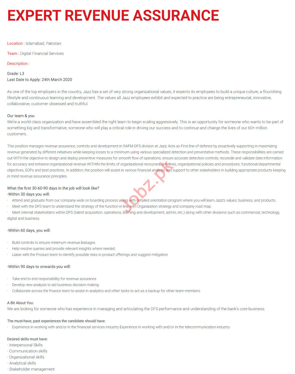 Apply as per details in job advertisement. Login to view further details of how to apply via https://www.jobz.pk online.