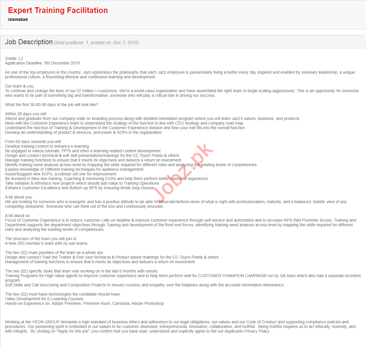 Apply as per details in job advertisement. Login to view further details of how to apply via https://www.jobz.pk online.