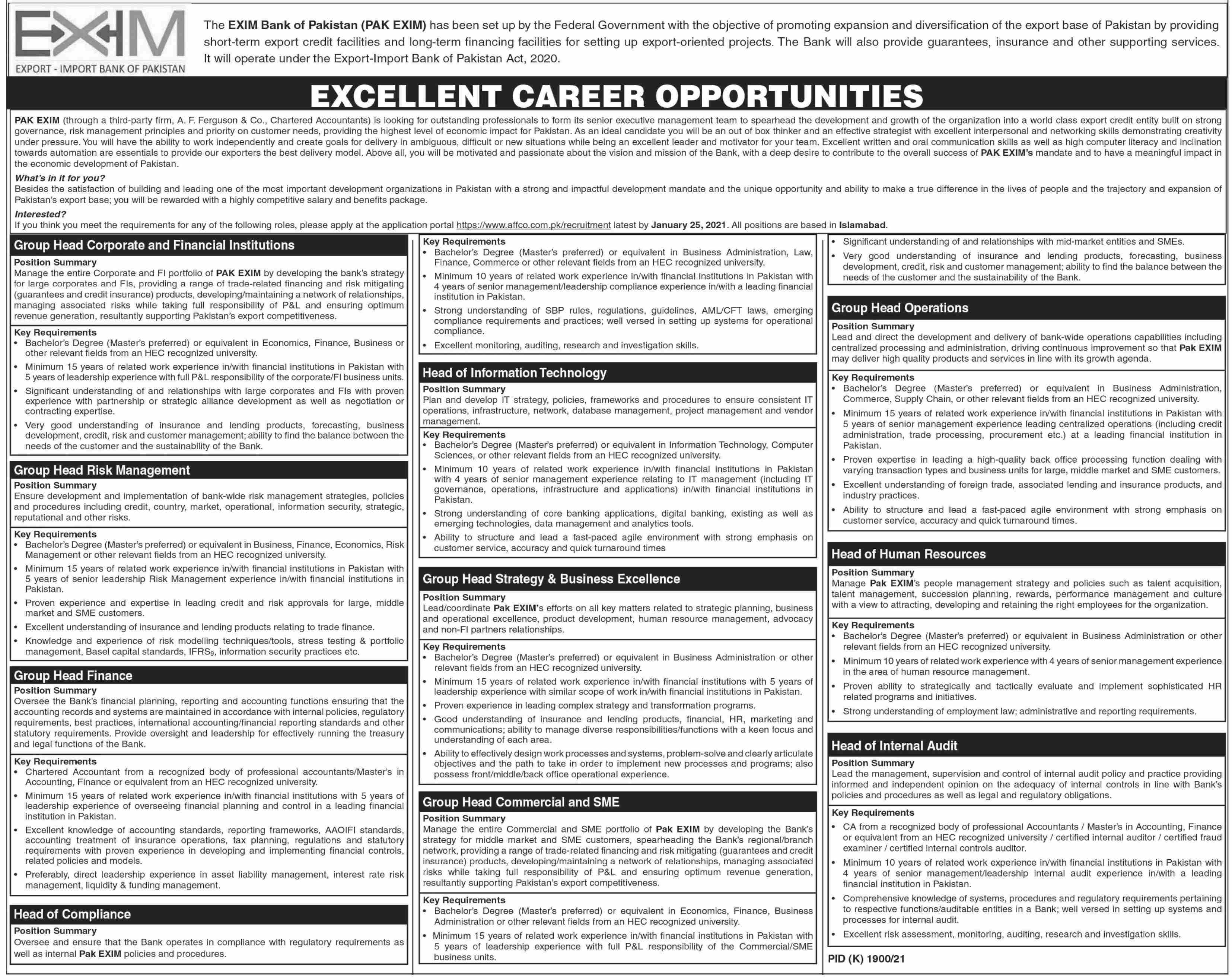 Export Import Bank of Pakistan IS hiring Group Head Corporate and Financial Institutions, Group Head Risk Management, Group Head Finance, Head of Compliance, Head of Information Technology, Group Head Strategy and Business Excellence, Group Head Commercial and SME, Group Head Operations, Head of Human Resources, Head of Internal Audit in Karachi.