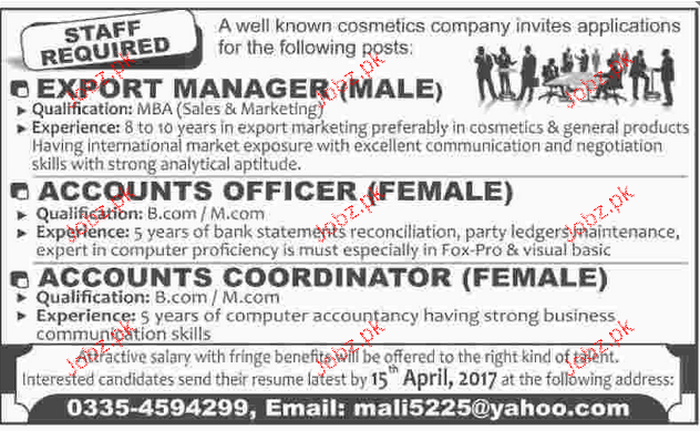 Export Manager, Accounts Officers Job Opportunity