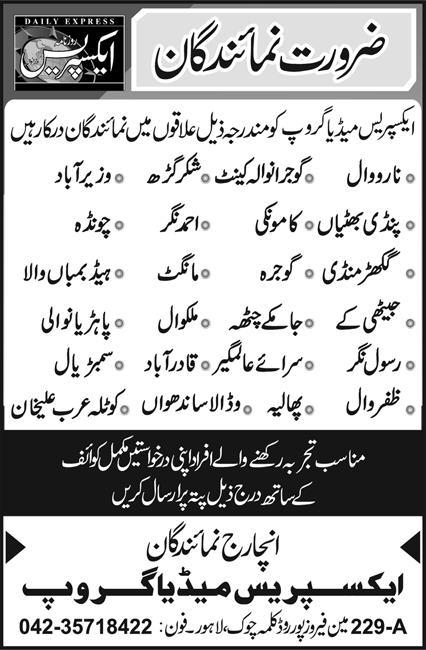 Express Media Group invites applications for job positions advertised in daily Express dated 3 February 2024 for following vacancies in Lahore, gujranwala, narowal, shakargarh, gojra, wazirabad, sarai alamgir, kamoke and malakwal Punjab Pakistan.