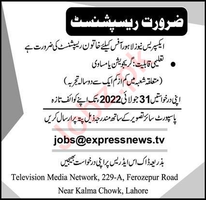 Vacant posts including receptionist are announced in Express News Lahore, lahore Punjab Pakistan as per 24 July 2022 advertisement in daily Express Newspaper. Educational qualifications required Bachelor and Master etc.