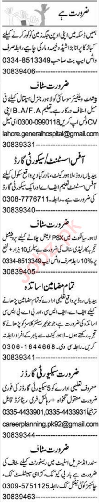 Vacant posts including chef, office assistant, security guard, cook, teacher, bar bq cook, medical staff and lady teacher are announced in Private Company Lahore, lahore Punjab Pakistan as per 2 January 2023 advertisement in daily Express Newspaper. Candidates with Middle, Matric, Intermediate and Bachelor etc. educational background will be preferred.