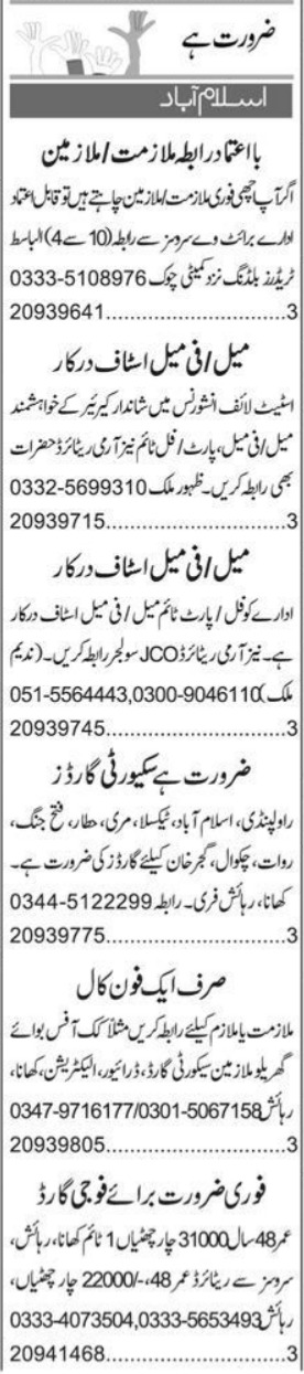 Private Company Islamabad, taxila, hattar, murree, fateh jang, gujar khan, rawalpindi and chakwal Islamabad Pakistan invites applications from eligible candidates for the post of house worker, solider, fauji guard, office boy, electrician, female office staff, office staff, cook, insurance agent, jco, security guard and driver as per advertisement of August 12, 2024 published in daily Express Newspaper. Candidates with Middle, Matric, Bachelor, Intermediate and BA etc. educational background will be preferred.