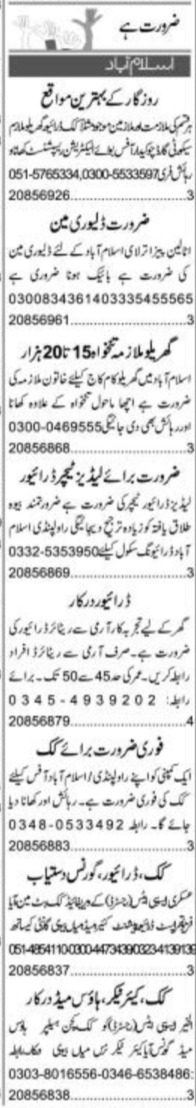 Private Company Islamabad, islamabad Islamabad Pakistan invites applications from eligible candidates for the post of governess, cook, nurse, husband wife, aya, security guard, batman, kitchen helper, house worker, delivery man, patient care, driver, ltv driver, house maid, physiotherapist, ladies teacher driver, chowkidar, maid, electrician, chef, receptionist and office boy as per advertisement of May 15, 2022 published in daily Express Newspaper. Persons with Intermediate, Middle, Primary and Matric etc. education can apply.