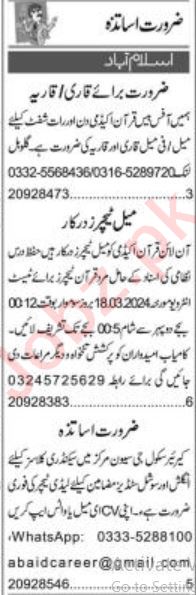 Private School Islamabad, islamabad Islamabad Pakistan invites applications from eligible candidates for the post of english teacher, social studies teacher, lady teacher, teacher, quran teacher, qariah and qari as per advertisement of March 18, 2024 published in daily Express Newspaper. Candidates with Master, M.sc, Bachelor, MA, BA and B.ed etc. educational background will be preferred.