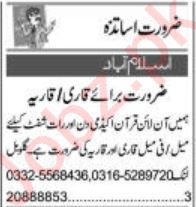 Vacant posts including quran teacher, qaria, qari and teacher are announced in Quran Academy Islamabad, rawalpindi Islamabad Pakistan as per 3 April 2023 advertisement in daily Express Newspaper. Persons with Bachelor and Intermediate etc. education can apply.