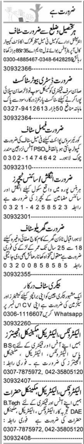 Private Company Allama Iqbal Town Lahore, lahore Punjab Pakistan invites applications from eligible candidates for the post of distributor, computer call operator, science teacher, accountant, female manager, office boy, manager, stockist, house servant, teacher, clerk and english teacher as per advertisement of September 22, 2025 published in daily Express Newspaper. Candidates with Bachelor, MA, Middle, Intermediate, BA and Matric etc. educational background will be preferred.