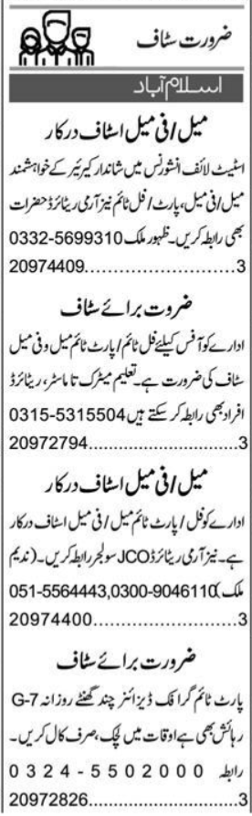 Vacant posts including jco, female office staff, office staff, insurance agent, solider and graphic designer are announced in Private Company G-7 Islamabad, rawalpindi Islamabad Pakistan as per 23 June 2025 advertisement in daily Express Newspaper. Educational qualifications required Intermediate, Matric, Middle, BA and Bachelor etc.
