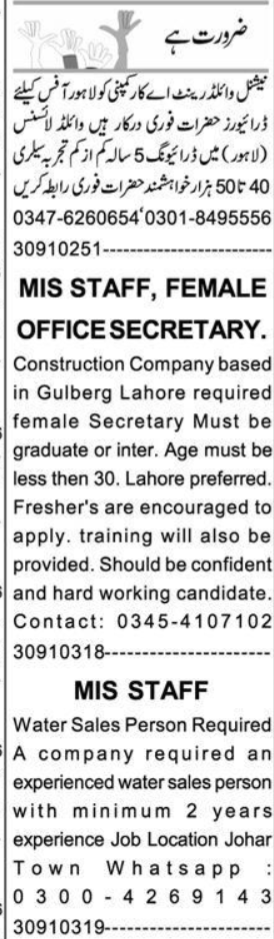 Private Company invites applications for job positions advertised in daily Express dated 24 February 2025 for following vacancies in Gulberg Lahore, lahore Punjab Pakistan.