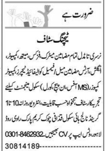 Private School jobs advertisement dated about 25 April 2022 in daily Express Newspaper invites application for the vacant post of computer teacher, female teacher, english teacher, computer composer, physics teacher, composer, arts teacher, teacher and mathematics teacher in Lahore, lahore Punjab Pakistan. Candidates with Bachelor, Master and Intermediate etc. educational background will be preferred.