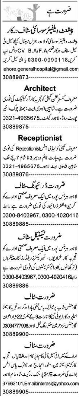 Vacant posts including driver, carpenter, driving staff, hospital staff, receptionist, store incharge, welder, cashier, office staff, salesman, fabricator, sales helper, office boy, lifter driver, crane driver, electrician, architect and lathe machine operator are announced in Private Company Lahore, lahore Punjab Pakistan as per 26 August 2024 advertisement in daily Express Newspaper. Preferred Education is B.com, Bachelor, Middle, BA, Intermediate, Matric, DAE and I.com etc.
