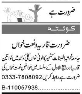 Quran Academy Quetta, quetta Balochistan Pakistan invites applications from eligible candidates for the post of teacher, qari and qaria as per advertisement of August 26, 2024 published in daily Express Newspaper. Intermediate and Matric etc. educational qualification will be preferred.