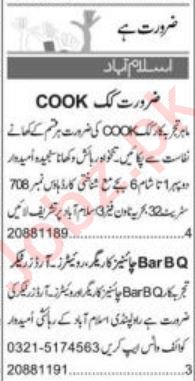 Vacant posts including order taker, bar bq cook, waiter, chef and cook are announced in Private Company Islamabad, rawalpindi Islamabad Pakistan as per 26 December 2022 advertisement in daily Express Newspaper. Preferred Education is Intermediate, Matric and Middle etc.