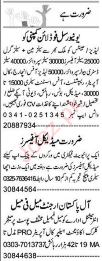 Private Company jobs advertisement dated about 27 February 2023 in daily Express Newspaper invites application for the vacant post of sales distributor supervisor, sales supervisor, receptionist, sales officer, sales girl, helper, medical officer, doctor, clerk, pro, salesman, manager, office incharge, call operator, accountant, public relation officer and office assistant in Faisalabad, faisalabad Punjab Pakistan. Matric, Middle, Intermediate, MBBS and Bachelor etc. educational qualification will be preferred.