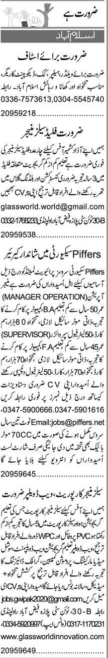 Private Company jobs advertisement dated about 27 January 2025 in daily Express Newspaper invites application for the vacant post of painter, sales manager corporate, welder, web developer, manager operation, helper, sales manager, cook and field sales manager in Islamabad, rawalpindi Islamabad Pakistan. Educational qualifications required Intermediate, Bachelor, Matric, Middle and BA etc.