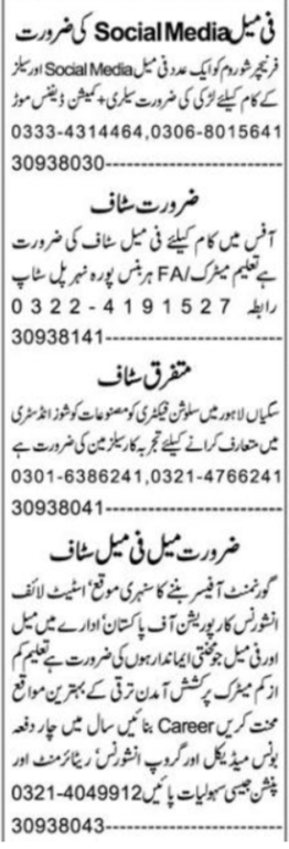 Vacant posts including salesman, office staff, social media officer, sales staff and insurance agent are announced in Private Company Harbanspura Lahore, lahore Punjab Pakistan as per 27 October 2025 advertisement in daily Express Newspaper. Educational qualifications required BA, Intermediate, Matric, Others, Middle and Bachelor etc.
