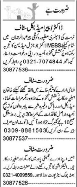 Private Company Lahore, lahore Punjab Pakistan invites applications from eligible candidates for the post of female helper, mbbs doctor, electrician, doctor and helper as per advertisement of April 29, 2024 published in daily Express Newspaper. Educational qualifications required Matric, MBBS, Intermediate and Middle etc.