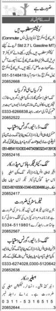 Private Company jobs advertisement dated about 4 April 2022 in daily Express Newspaper invites application for the vacant post of caretaker, patientcare, driver, air condition installer, governess, house maid, tailor master, maid, kitchen helper, aya, helper, nurse, batman, husband wife, female nurse, cook helper, technician helper, civil guard, cook, office staff and physiotherapist in Islamabad, islamabad Islamabad Pakistan. Educational qualifications required Intermediate, Middle, Bachelor and Matric etc.