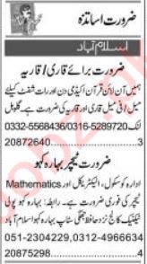 Private School jobs advertisement dated about 31 October 2022 in daily Express Newspaper invites application for the vacant post of female teacher, quran teacher, qari, teacher, mathematics teacher and qaria in Islamabad, islamabad Islamabad Pakistan. Preferred Education is Master and Bachelor etc.