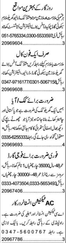 Private Company Islamabad, rawalpindi Islamabad Pakistan invites applications from eligible candidates for the post of cook, ac technician installer, fauji guard, receptionist, office boy, security guard, chowkidar, driver, helper, house worker, aya and electrician as per advertisement of May 5, 2025 published in daily Express Newspaper. Persons with Intermediate, Bachelor, Middle, Matric, DAE and BA etc. education can apply.