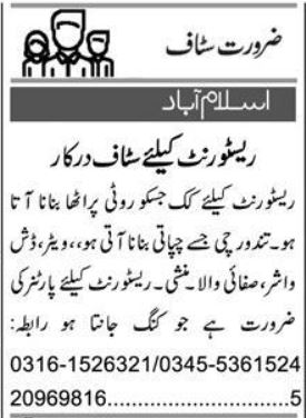 Restaurant jobs advertisement dated about 5 May 2025 in daily Express Newspaper invites application for the vacant post of sweeper, waiter, dishwasher, munshi, cook and tandoorchi in Islamabad, islamabad Islamabad Pakistan. Primary, Intermediate, Middle and Matric etc. educational qualification will be preferred.