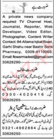 Private Company Lahore, lahore Punjab Pakistan invites applications from eligible candidates for the post of 3d designer, reporter, tv channel host, journalist, autocad draftsman, photographer, web developer, machine operator, content writer, video editor and draftsman as per advertisement of September 5, 2022 published in daily Express Newspaper. Preferred Education is Intermediate, Matric, Bachelor and Middle etc.