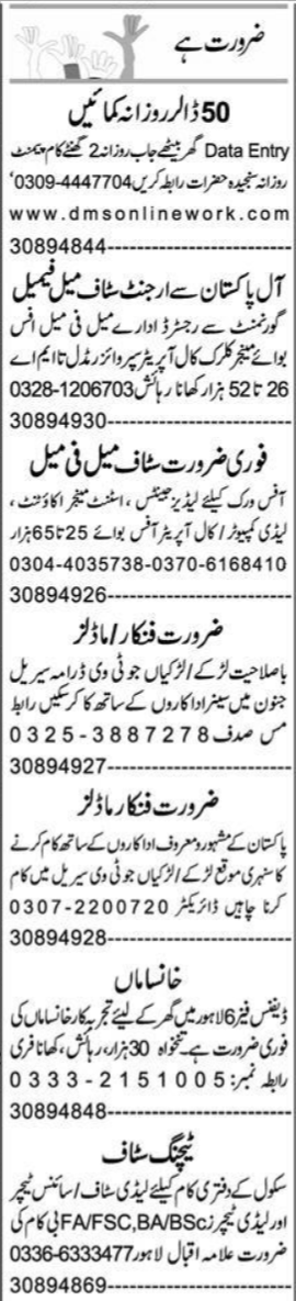 Vacant posts including office boy, lady computer operator, computer operator, manager, science teacher, assistant manager accounts, supervisor, actor, data entry operator, call operator, lady teacher, model, clerk, teacher, cook and khansama are announced in Private Company Lahore, lahore Punjab Pakistan as per 7 October 2024 advertisement in daily Express Newspaper. Preferred Education is Matric, Intermediate, Middle, Bachelor, ACCA, B.com, BA and BBA etc.