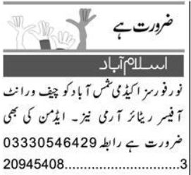 Noor Forces Academy is looking for candidates for following posts as per job advertisement published in daily Express Newspaper of September 9, 2024 for location Islamabad, islamabad Islamabad Pakistan: