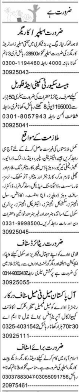 Private Company jobs advertisement dated about 14 July 2025 in daily Express Newspaper invites application for the vacant post of doctor, warehouse manager, clerk, auto mechanic, sonographer, primary school teacher, security guard, cook, worker, painter, electrician, coordinator, manager, accountant, electrical engineer, computer call operator, farm worker, plumber, deco painter, security staff, truck driver, welder, software developer, cleaner, office boy, care giver, nurse, data analyst, pharmacist, carpenter, helper and factory worker in Faisalabad, lahore Punjab Pakistan. Intermediate, BCS, BA, Others, Bachelor, B.com, MBBS, DAE, Middle and Matric etc. educational qualification will be preferred.