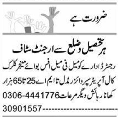 Vacant posts including office boy, manager, call operator, supervisor and clerk are announced in Private Company Faisalabad, faisalabad Punjab Pakistan as per 2 December 2024 advertisement in daily Express Newspaper. Educational qualifications required Intermediate, Matric, BA, Bachelor and Middle etc.